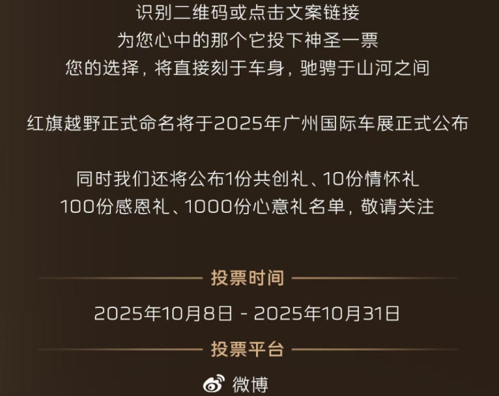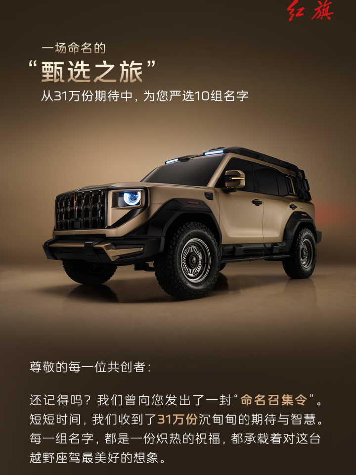 经22.3万位网友投票, 红旗越野最终将命名“1927”, 你喜欢吗?