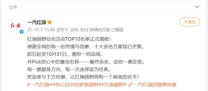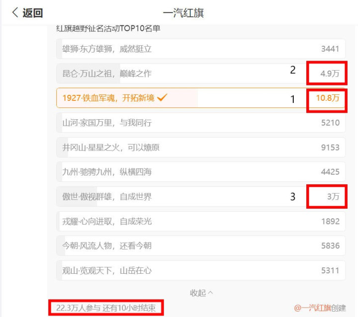 兄弟们,红旗越野的征名活动没有悬念了啊。截止2025年10月31日14:00,目前网上已有超过10.8万人将手里的票投给了1927,而排在第二三位的命名则是昆仑和傲世,票数分别为4.9万和3万。